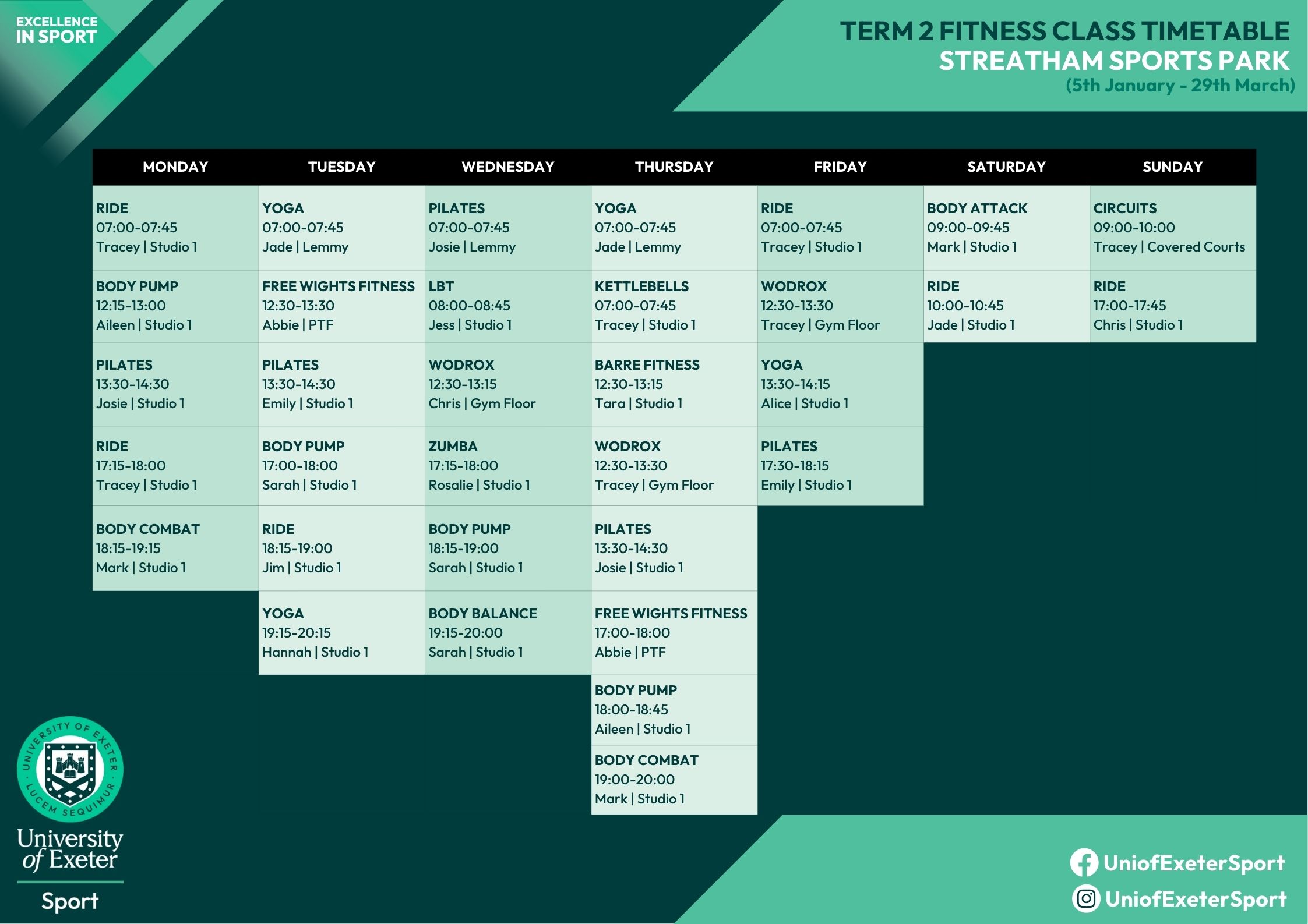 If you cannot attend a booked class, please contact reception on 01392 724452 or exetersport@exeter.ac.uk, giving as much notice as possible. If you fail to do so, you may be charged the full price of the class.